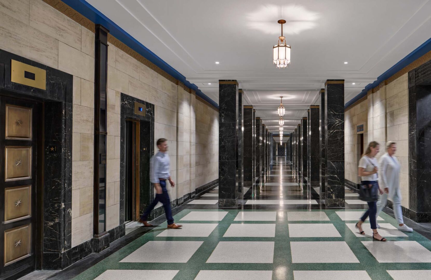 Historic elements including two monumental staircases and the art deco detailing and finishes of a major corridor were faithfully restored.