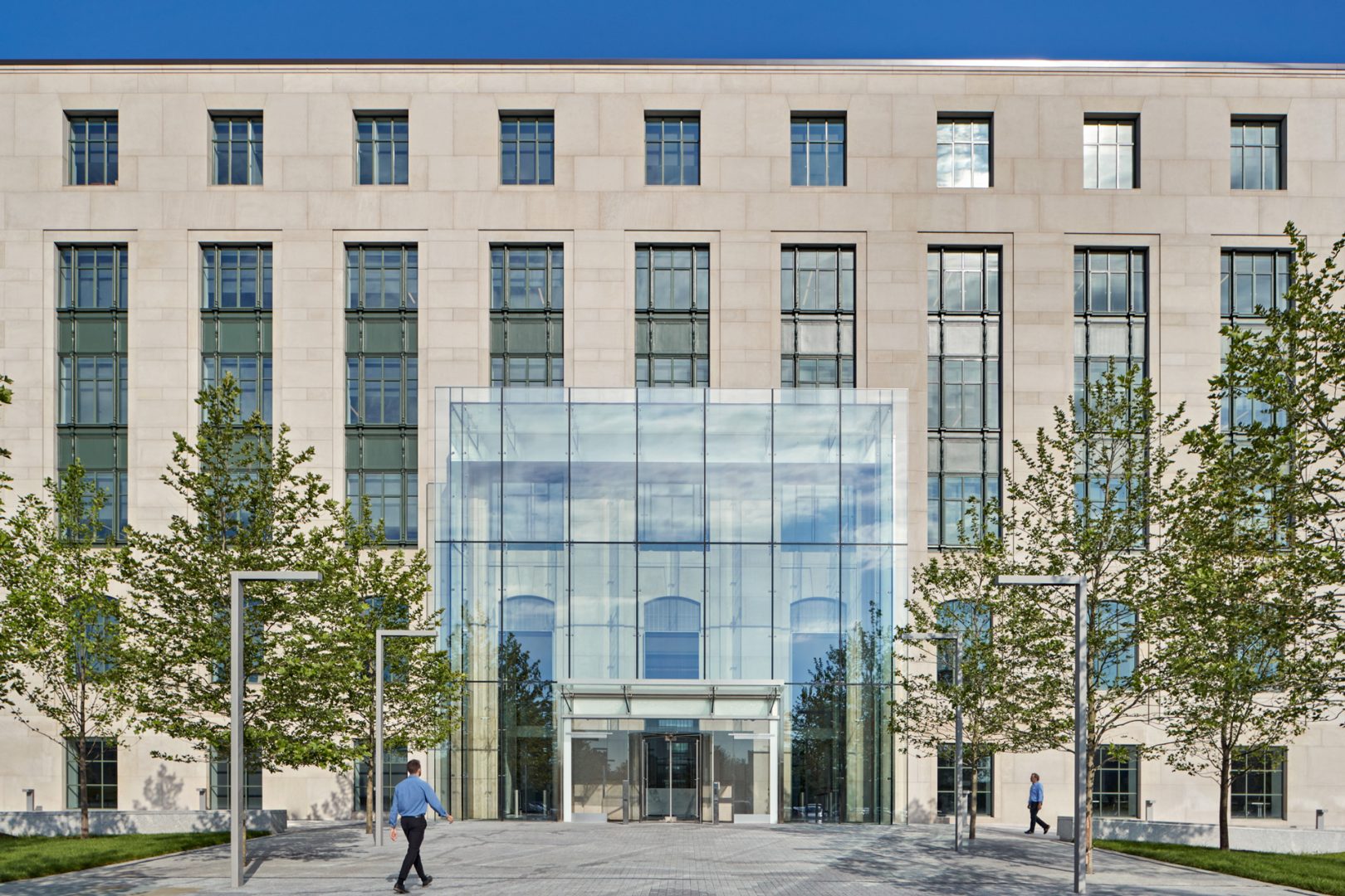 A two-story “glass box” faces the green space and visually connects to the courtyard and new two-story lobby clad in white natural stone.on