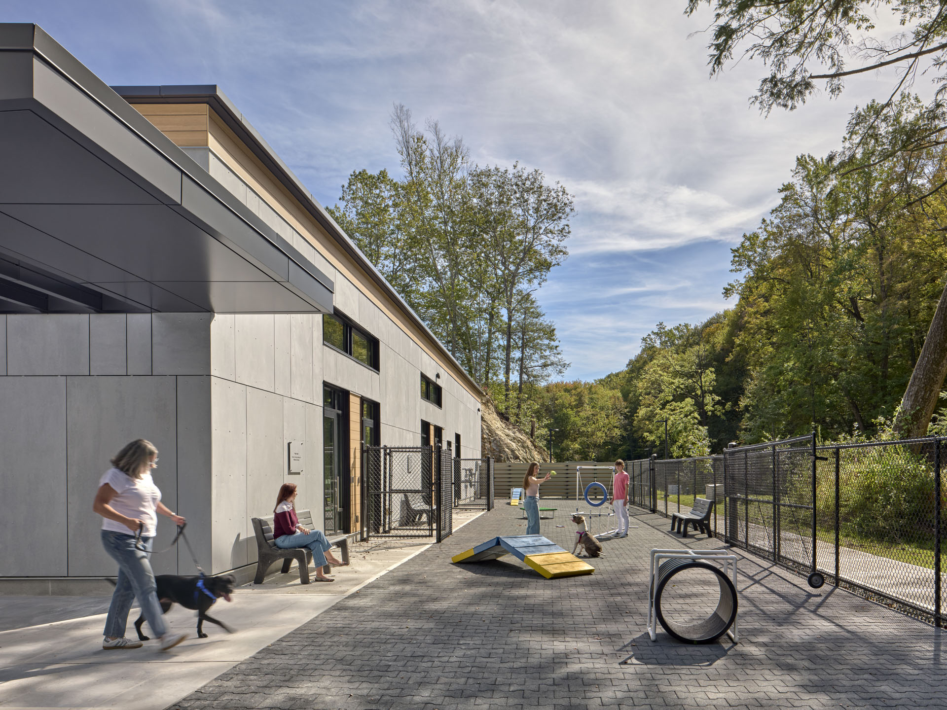 The design responds to the wooded hillside setting with warm, natural materials that break down the building’s scale and create an inviting presence. A tall, transparent entry atrium filled with natural daylight establishes an open, welcoming atmosphere. The building’s exterior materials – featuring subtle, warm tones and natural variation – blend with the surrounding landscape while maintaining a modern aesthetic. Interior spaces are thoughtfully organized with separate entrances for privacy during difficult moments, sound-insulated kennels with natural light, and dedicated wellness areas for staff.