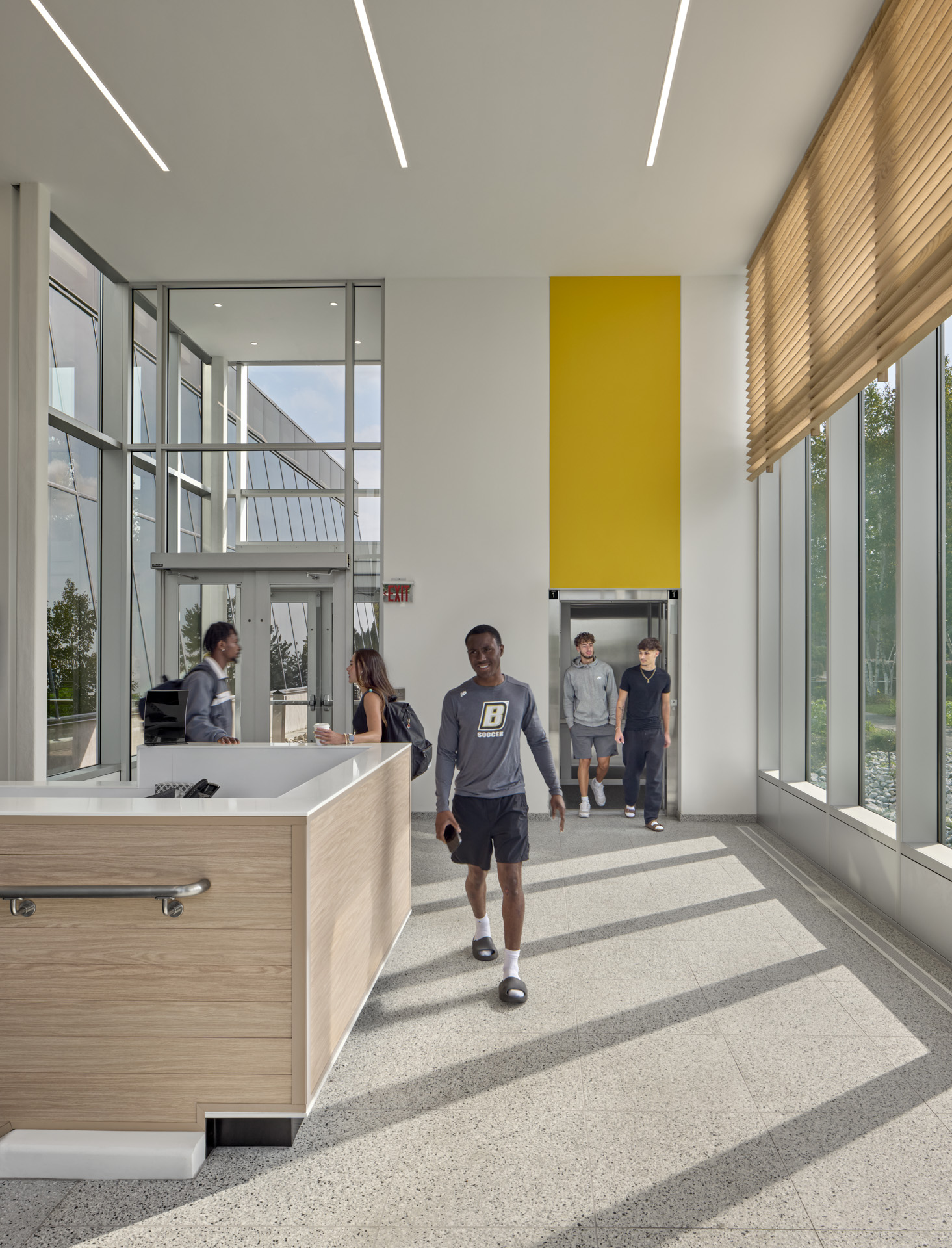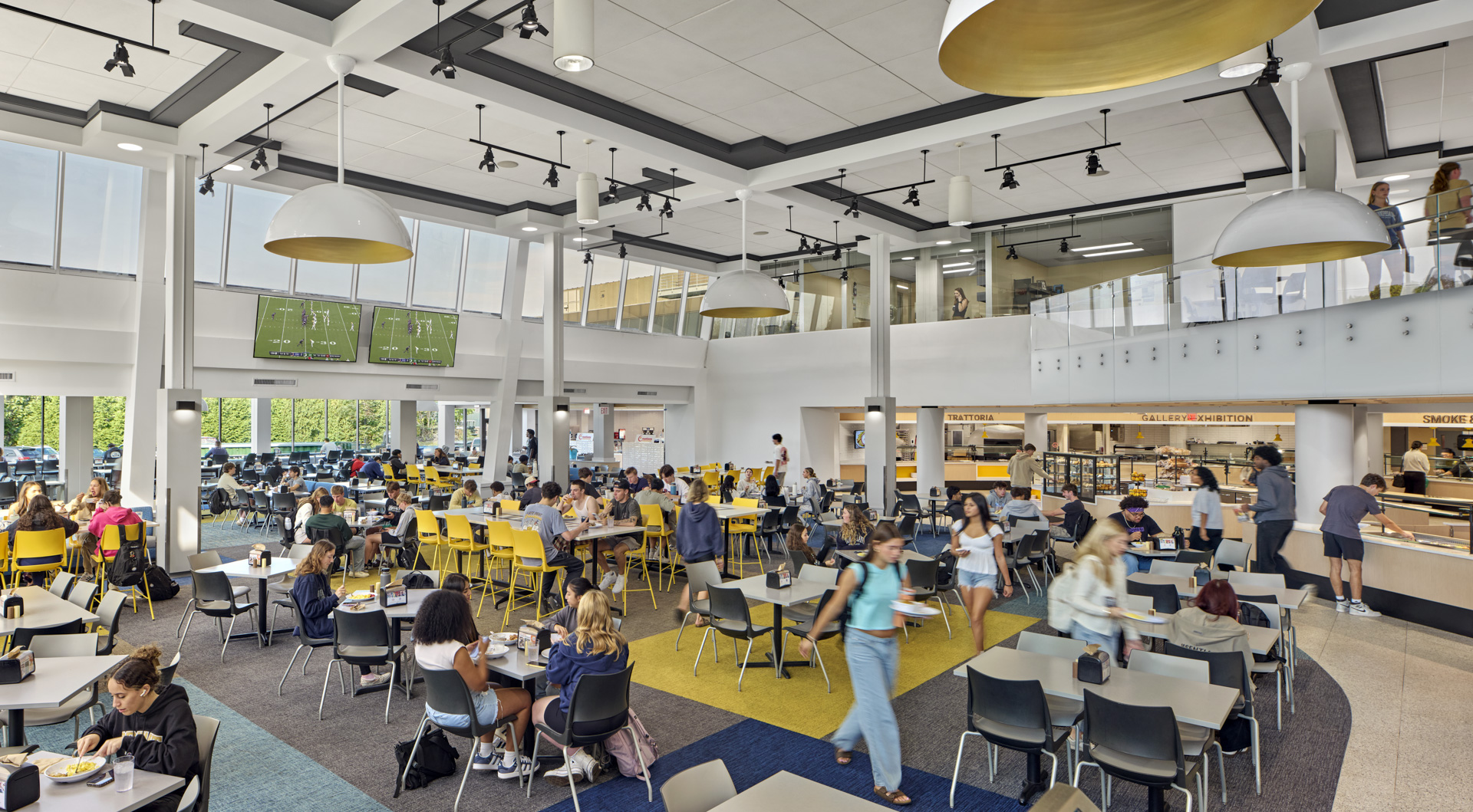 Bryant University’s Salmanson Dining Hall within the iconic Unistructure Building had become outdated and no longer met the evolving needs of the campus community. Students faced limited food options, congested circulation patterns, and accessibility challenges that impacted their daily dining experience. The existing 25,000 sf space lacked modern amenities and efficient service areas, creating bottlenecks during peak hours and limiting the quality of campus dining expected at a premier university.