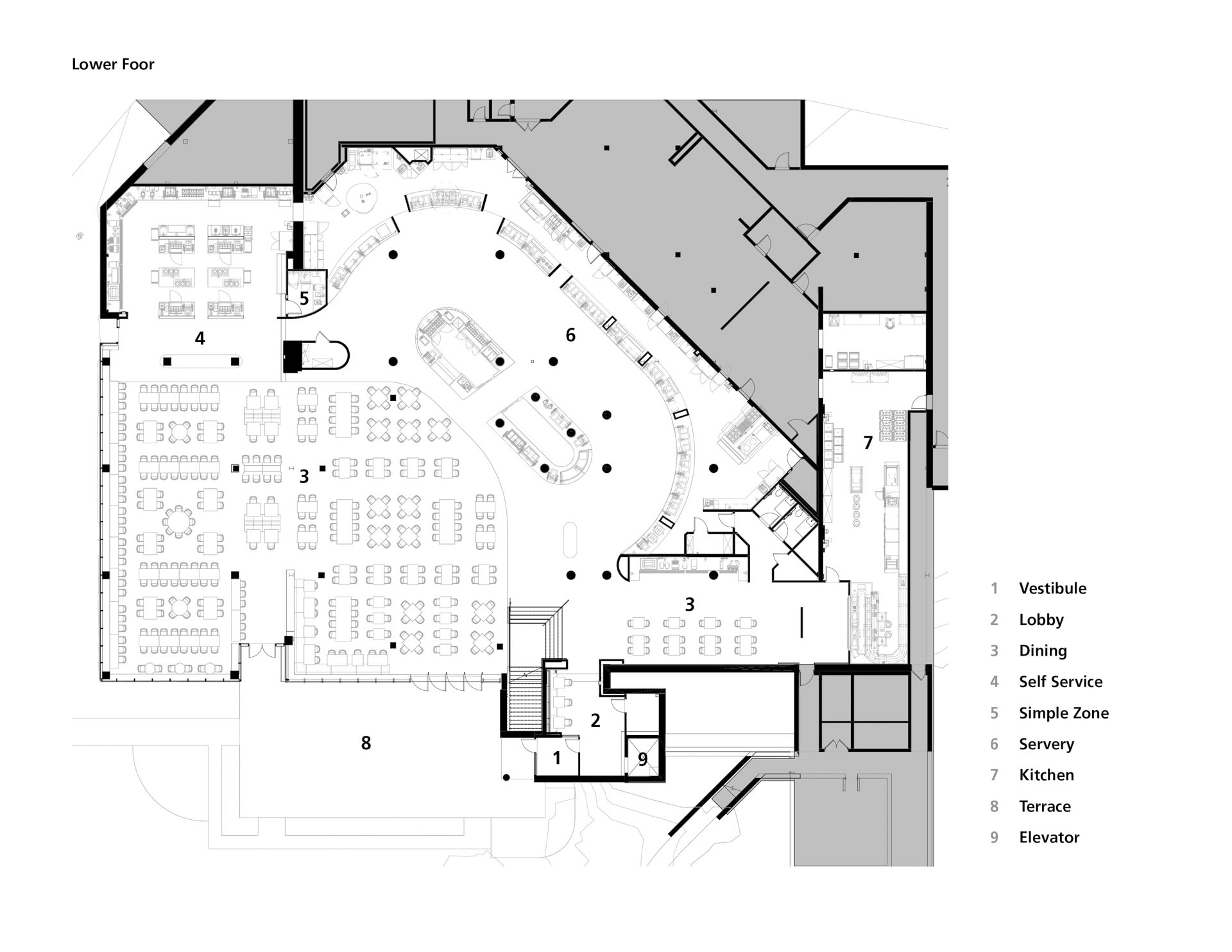 The comprehensive renovation transformed the dining hall into a state-of-the-art culinary destination spanning approximately 30,000 sf across two levels. A striking new circulation addition on the south elevation features a grand stair, new mezzanine level, elevator, and an impressive 1,000 sf two-story entryway with curtain wall that dramatically enhances functionality and visual appeal. The modern servery offers expanded and diverse food options, while back-of-house improvements include a full kitchen, automated dishwashing line, loading dock, and refrigerated storage spaces.
